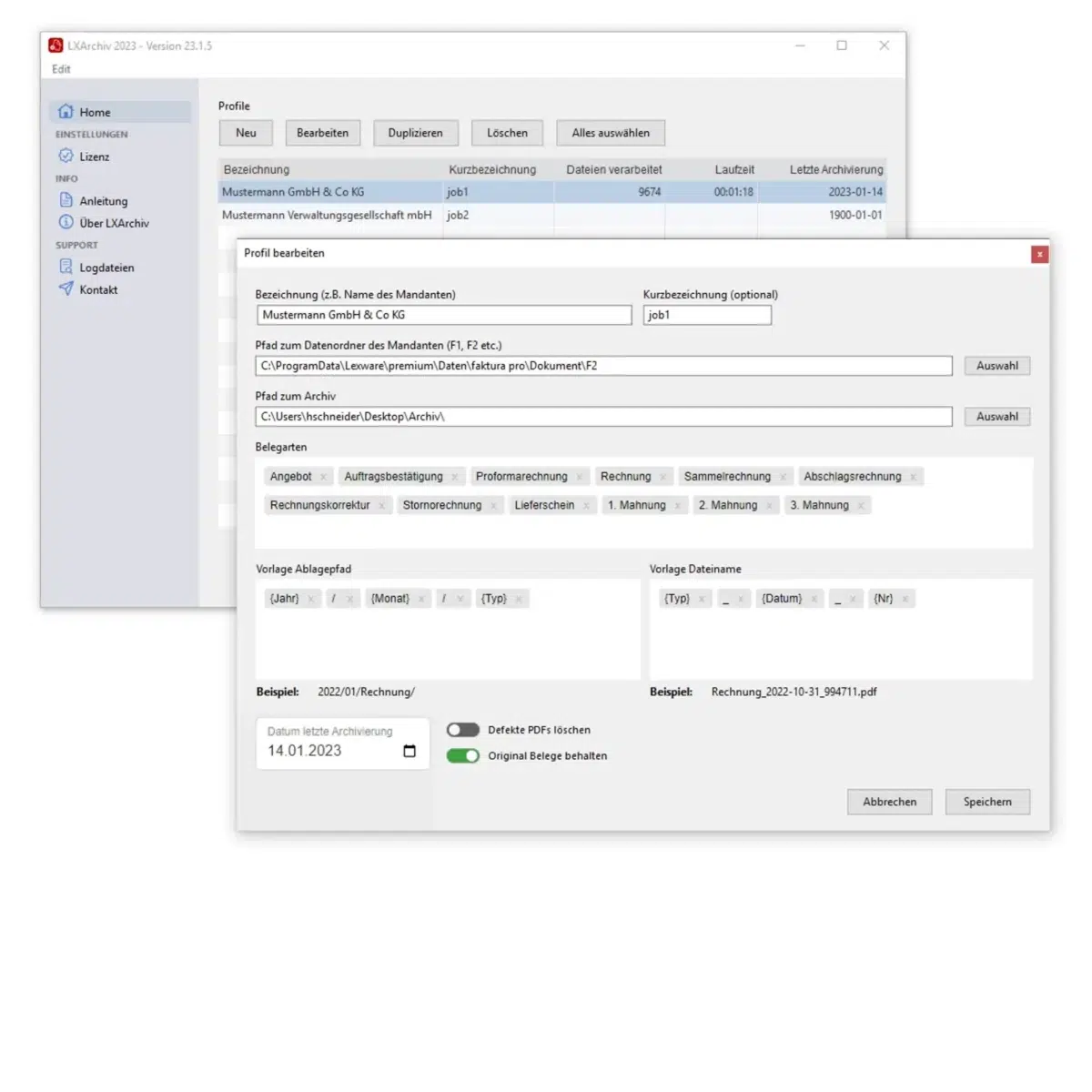 Pfad- und Dateinamen können nach Belieben aus Belegtyp, Datum, Monat, Jahr und Kundennummer zusammengebaut werden. Strukturieren Sie Ihre Ablage ganz nach Ihren persönlichen Wünschen.